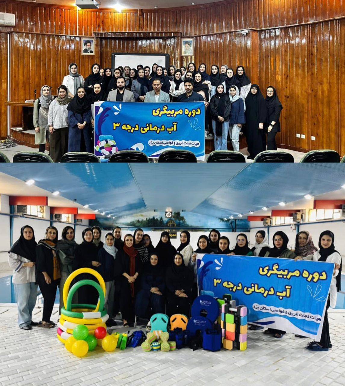 به گزارش روابط عمومی فدراسیون نجاتغریق و غواصی و به نقل از هیات استان یزد، دوره عملی مربیگری آبدرمانی درجه ۳ آقایان با نظارت فدراسیون نجات غریق زیر نظر مسئول کمیته آب درمانی استان سیدمحمد علویه برگزار شد. همچنین دوره مربیگری آبدرمانی درجه سه بانوان با حضور ۳۴ نفر متقاضی به مدرسی ملیسا سادات طباطبایی مسئول کمیته آموزش فدراسیون طی چهار روز برگزار شد.